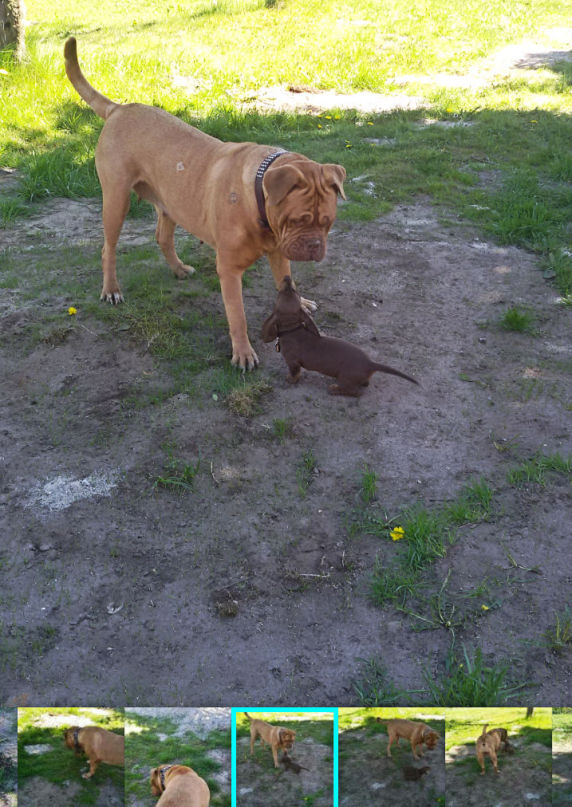 Arya (die jetzt Rosi heißt) mit ihrer großen Bordeaux-Doggen Freundin Käthe. Auch mit dem kleinen Sohn Piet versteht sie sich super.