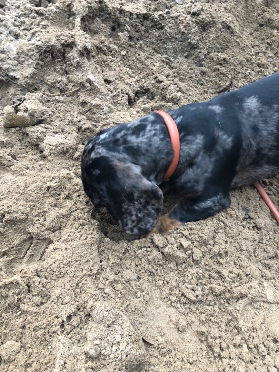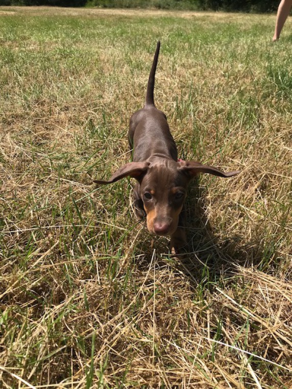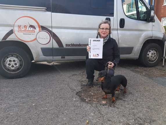 ich bin ganz stolz, Ihnen ein Foto von Amira schicken zu können, das sie abbildet nachdem sie gestern im Mantrailing ihre 2. Prüfung bestanden hat. Mein kleiner Renndackel!