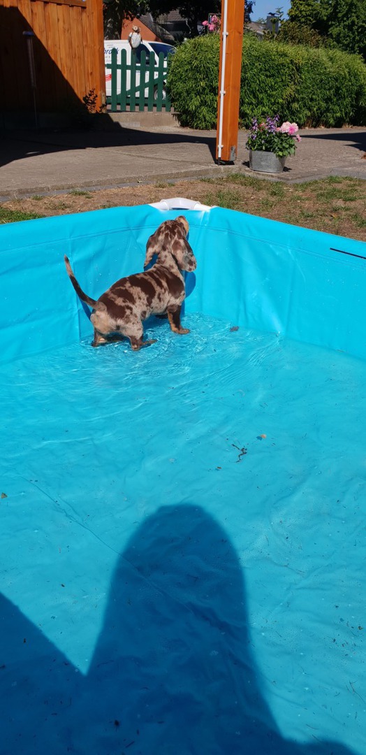 Auch die kleine Maus Bailey Summer ist angekommen und hat uns tolle Bilder geschickt. Sie hat den Namen Lina bekommen und auch schon eine erste Begegnung mit dem Pool gemacht.