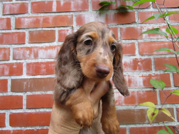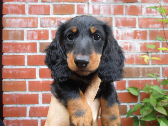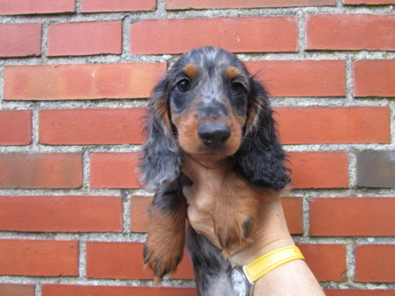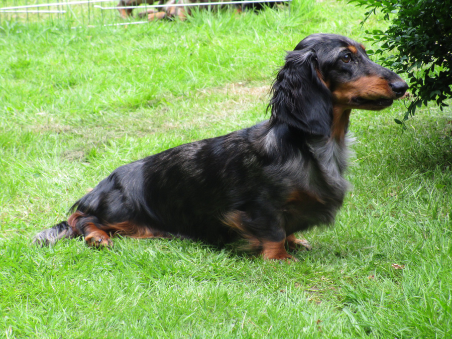Zwei Rüden schwarzgefleckt, ein Rüde schwarz-rot, und die beiden Hündinnen in sind braun mit Abzeichen und schwarzgefleckt.