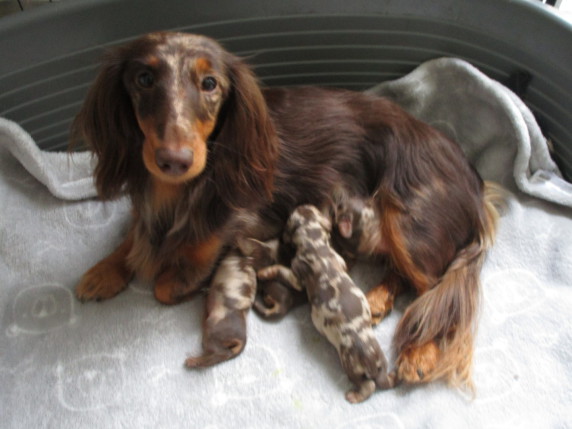 Allen geht es gut, sind munter und erholen sich nun erst einmal von der Geburt, Empire kümmert sich hervorragend um ihre Welpen.
