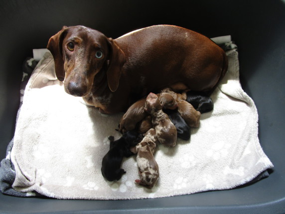 9 gesunde Welpen in einer langen aber instinktsicheren Geburt.