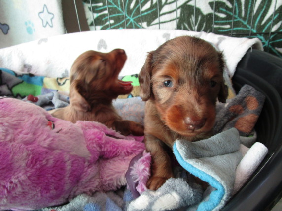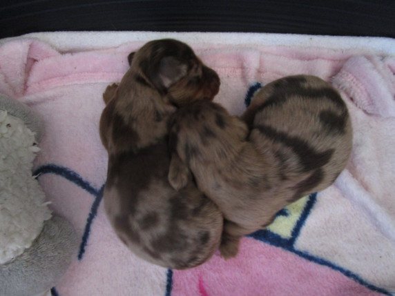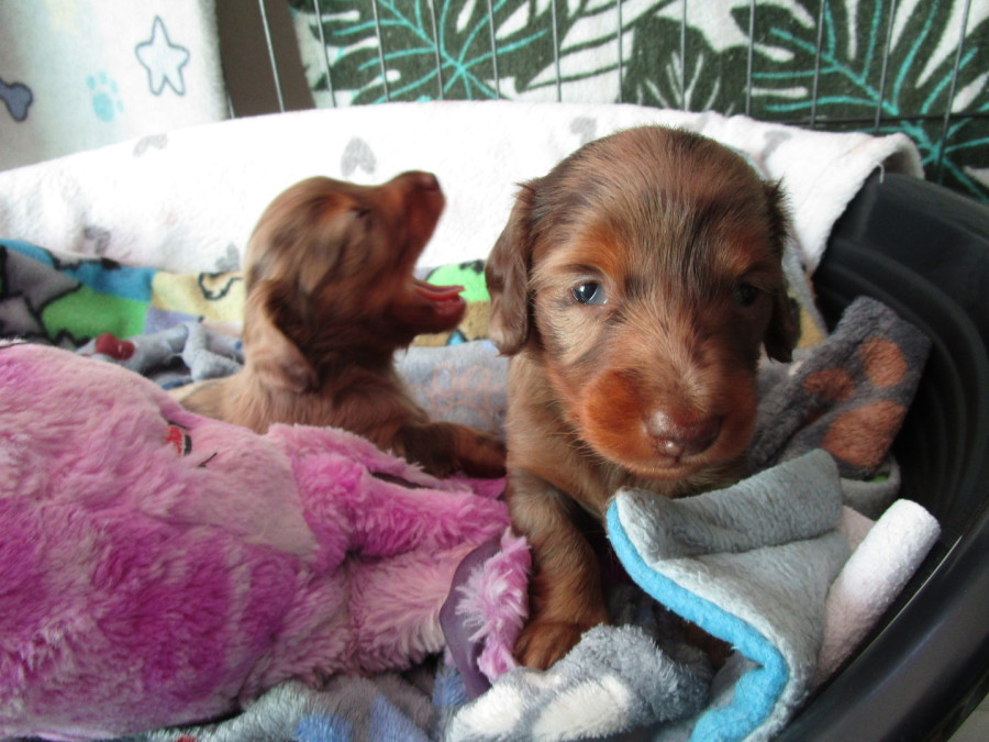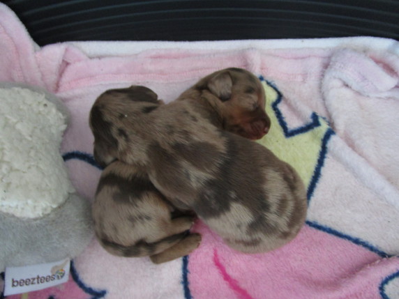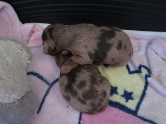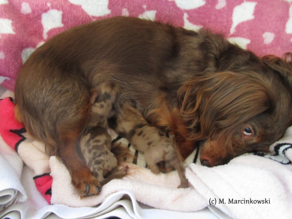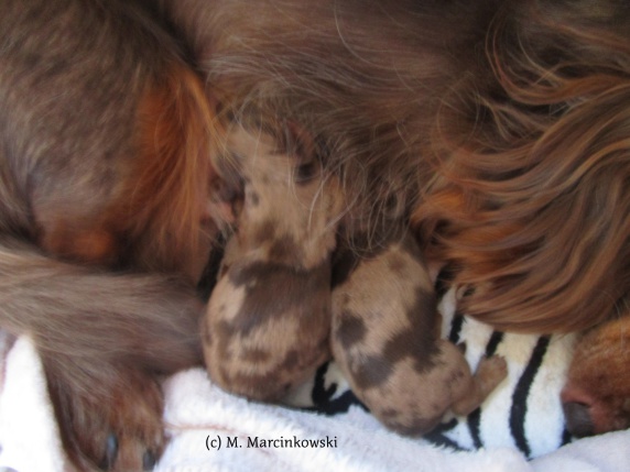 Mit ebenso großer Freude können wir verkünden, dass unsere geliebte Zwergenhündin Toffifee von der Allerbäcke heute in einer routinierten Geburt zwei braungefleckten Rüdenwelpen das Leben schenkte. Es ist ihr letzter Wurf, wir sind ihr so dankbar für alle Welpen, die sie uns geschenkt hat. Wie immer kümmert sie sich rührend um ihr beiden Welpen und versorgt sie souveran.