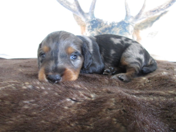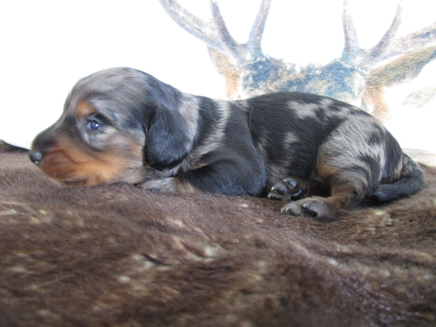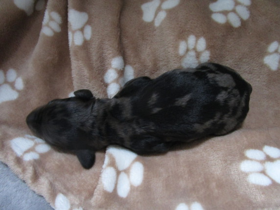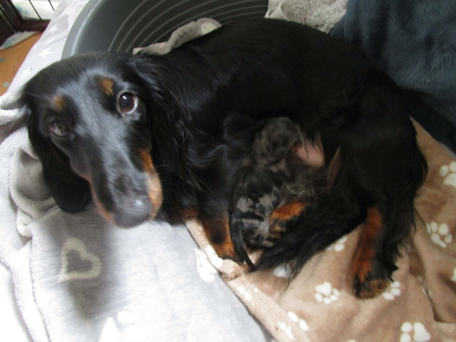 Suri schenkte uns in einer unkomplizierten am Morgen einen Rüden in der Farbe schwarz-gefleckt. Darüber sind wir sehr glücklich und freuen uns, dass es Mutter und Sohn gut geht.